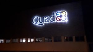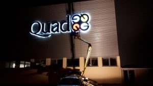 Logo Quad w Wyszkowie by witek-admin Litery podświetlane Logo wysokości 3,5 m z blachy aluminiowej i poliwęglanu podświetlane ledowo.