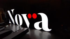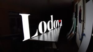 Litery z białej taśmy aluminiowej. Lico z plexy , podświetlenie szerokokątnymi modułami led.